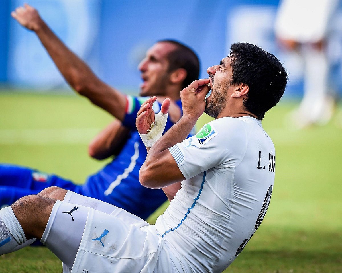 রেফারিকে কামড়ের দাগ দেখাচ্ছেন কিয়েলিনি।মজার ব্যাপার হলো, সুয়ারেজের ক্যারিয়ারে এটিই প্রথম কামড় ছিল না। এর আগেও ডাচ লিগে এবং ইংলিশ প্রিমিয়ার লিগে খেলার সময় তিনি দুবার প্রতিপক্ষকে কামড়ে দিয়ে নিষিদ্ধ হয়েছিলেন। ডাচ লিগে তাঁর ডাকনাম হয়ে গিয়েছিল ‘ক্যানিবাল’। ইংলিশ লিগে তাঁকে অনেকে ‘ড্রাকুলা’ বা ‘ভ্যাম্পায়ার’ বলেও ডাকে। মজার ব্যাপার হলো, সেটাই ছিল বিশ্বকাপে ইতালির খেলা শেষ ম্যাচ। এরপর দুই বিশ্বকাপ পেরিয়ে গেলেও বিশ্বকাপ খেলার সুযোগ হয়নি আজ্জুরিদের। আর তাদের শেষ বিশ্বকাপ খেলার স্মৃতি স্মরণীয় হয়ে আছে সুয়ারেজের কামড়কাণ্ডে।